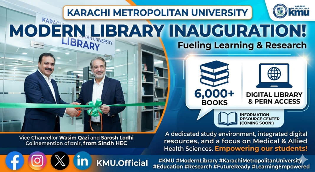 کراچی (تعلیمی رپورٹر) کراچی میٹروپولیٹن یونیورسٹی نے طلبہ کے لیے تعلیمی و تحقیقی سہولیات کو بہتر بنانے کے مقصد سے ایک جدید لائبریری کا باقاعدہ افتتاح کر دیا ہے